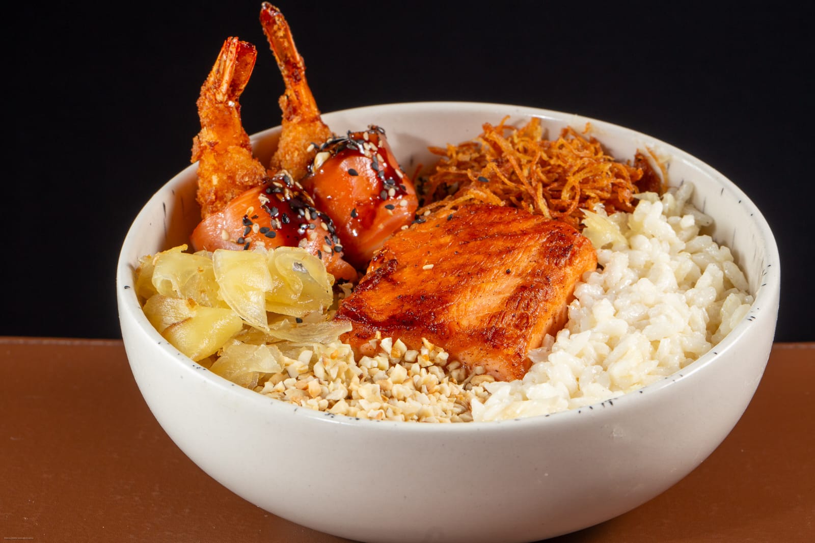 • Prato principal ( R$ 50) – Beach Pecado Poke (risoto de gengibre, salmão na chapa, camarão empanado envolto de salmão ao molho teriyaki e gergelim, acompanhado de gengibre caramelizado, farofa de castanha e crispy de batata-doce)