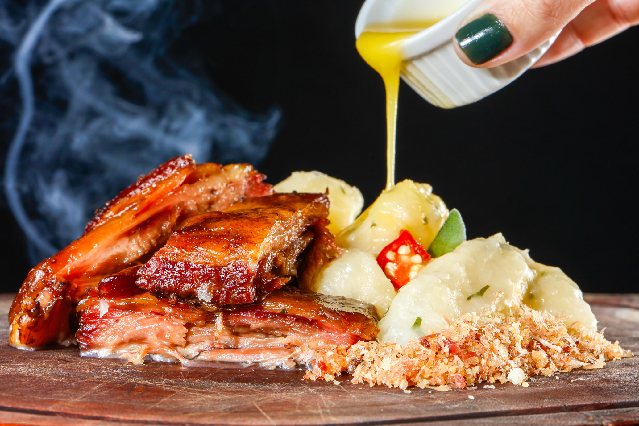 • Entrada (R$ 35) – Porcopoca com BBQ de Rapadura (tiras crocantes de barriga de porco à pururuca com barbecue de rapadura, gengibre e cachaça Reinert, de Pomerode/SC)