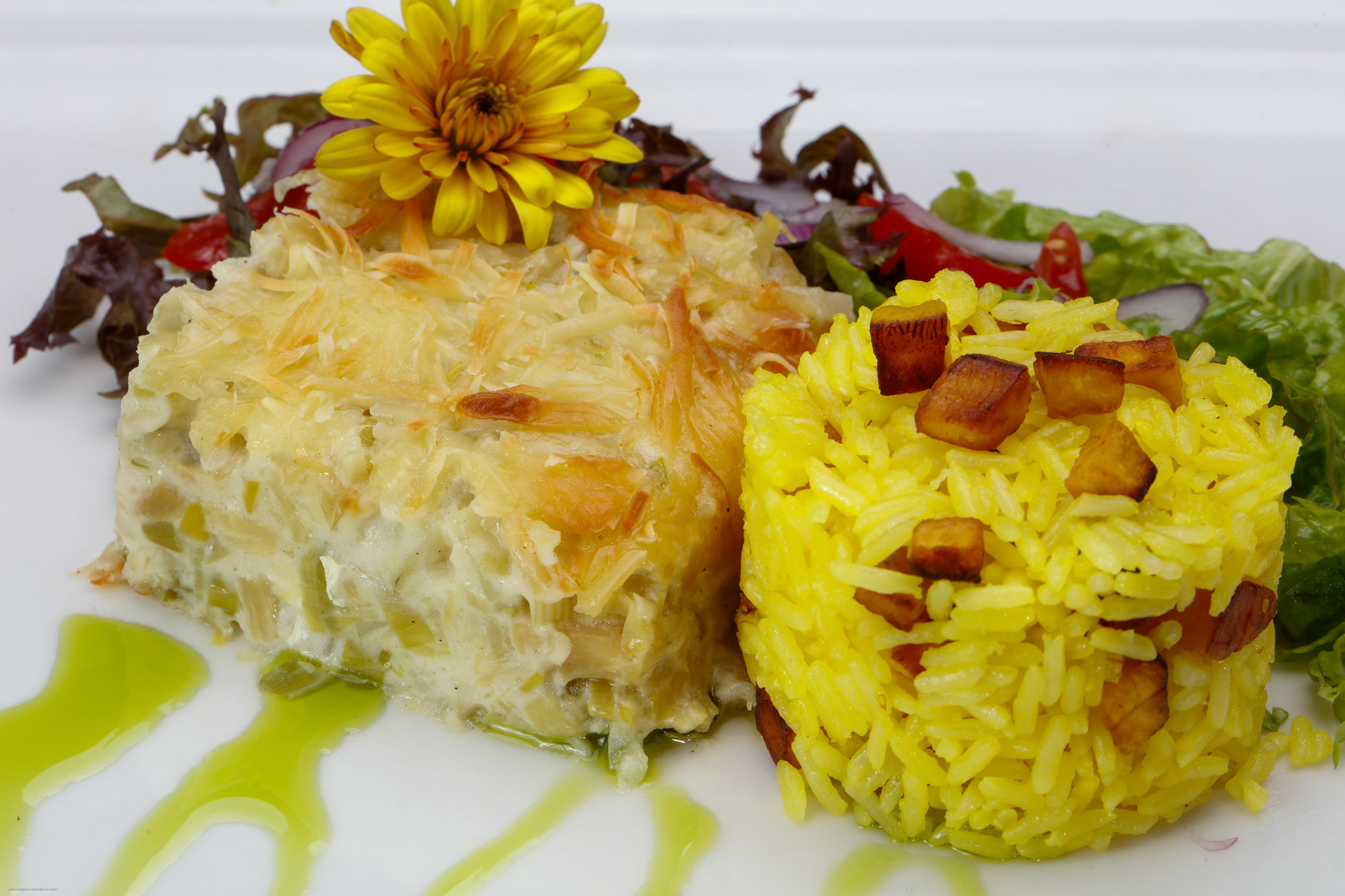 • Prato principal (R$ 40) – Bacalhau de Sant’ Anna (bacalhau em lascas, batatas em cubos, molho bechamel e muçarela gratinada, acompanhado por arroz de açafrão com banana da terra e salada de folhas com tomate cereja finalizado com azeite verde)