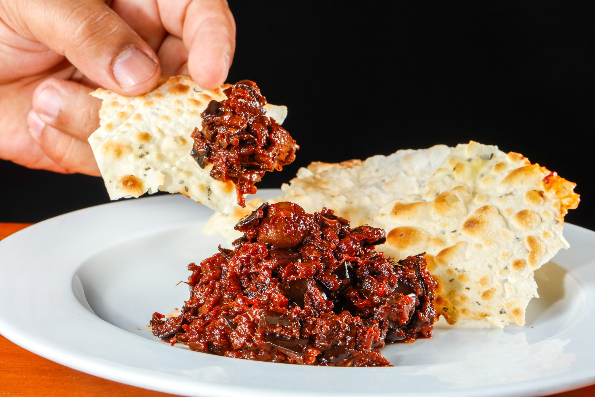 • Entrada ( R$ 29)- Caponata da Nonna (caponata de beringela, pasta de tomate, uvas passas e azeitonas, servida com uma crocante massa branca com alecrim)