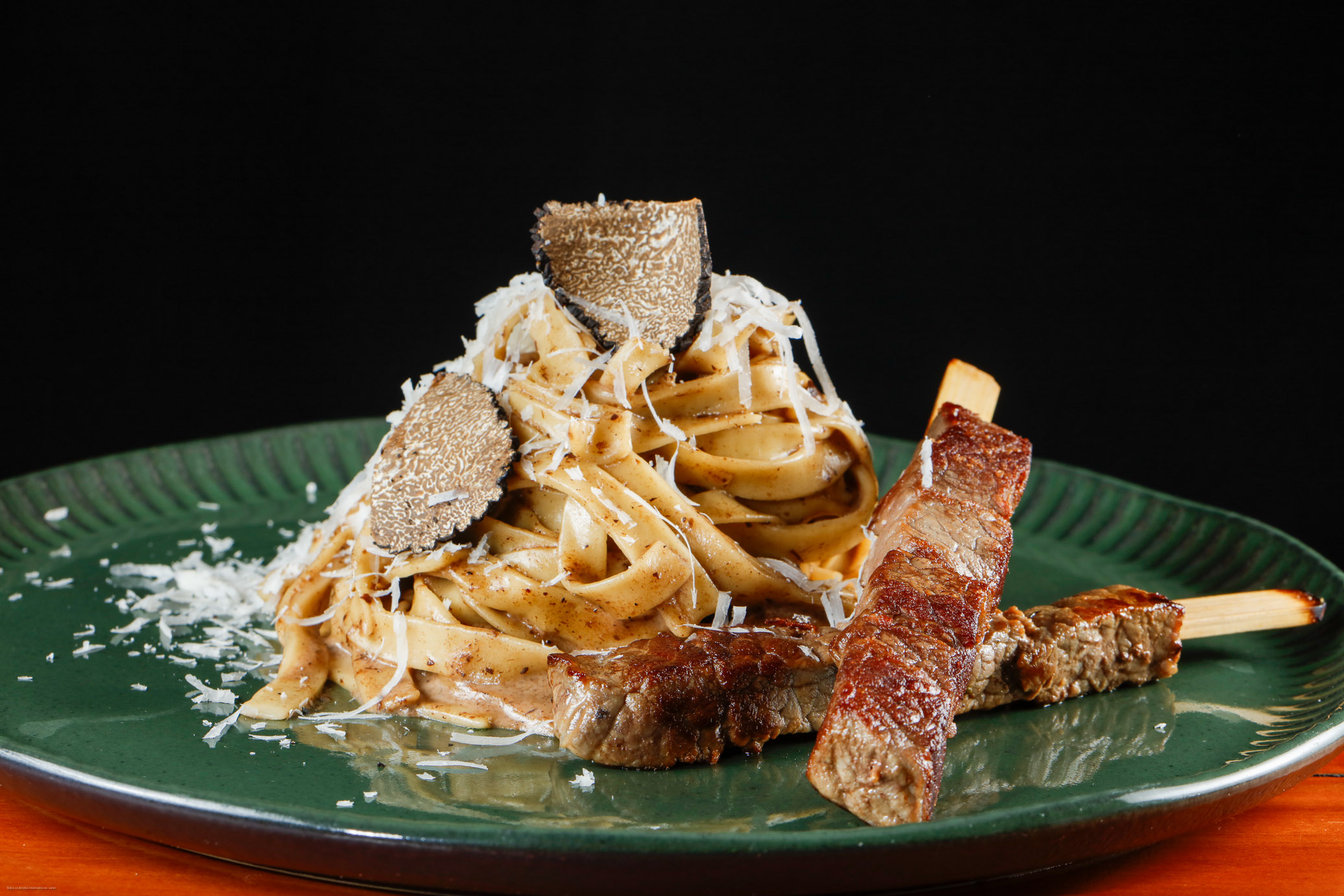 • Prato principal ( R$ 45)- Tartufi Divini (talharim artesanal com molho à base de funghi porccini e creme de leite fresco, finalizado com trufas e acompanhado de um espetinho de bombom da alcatra)