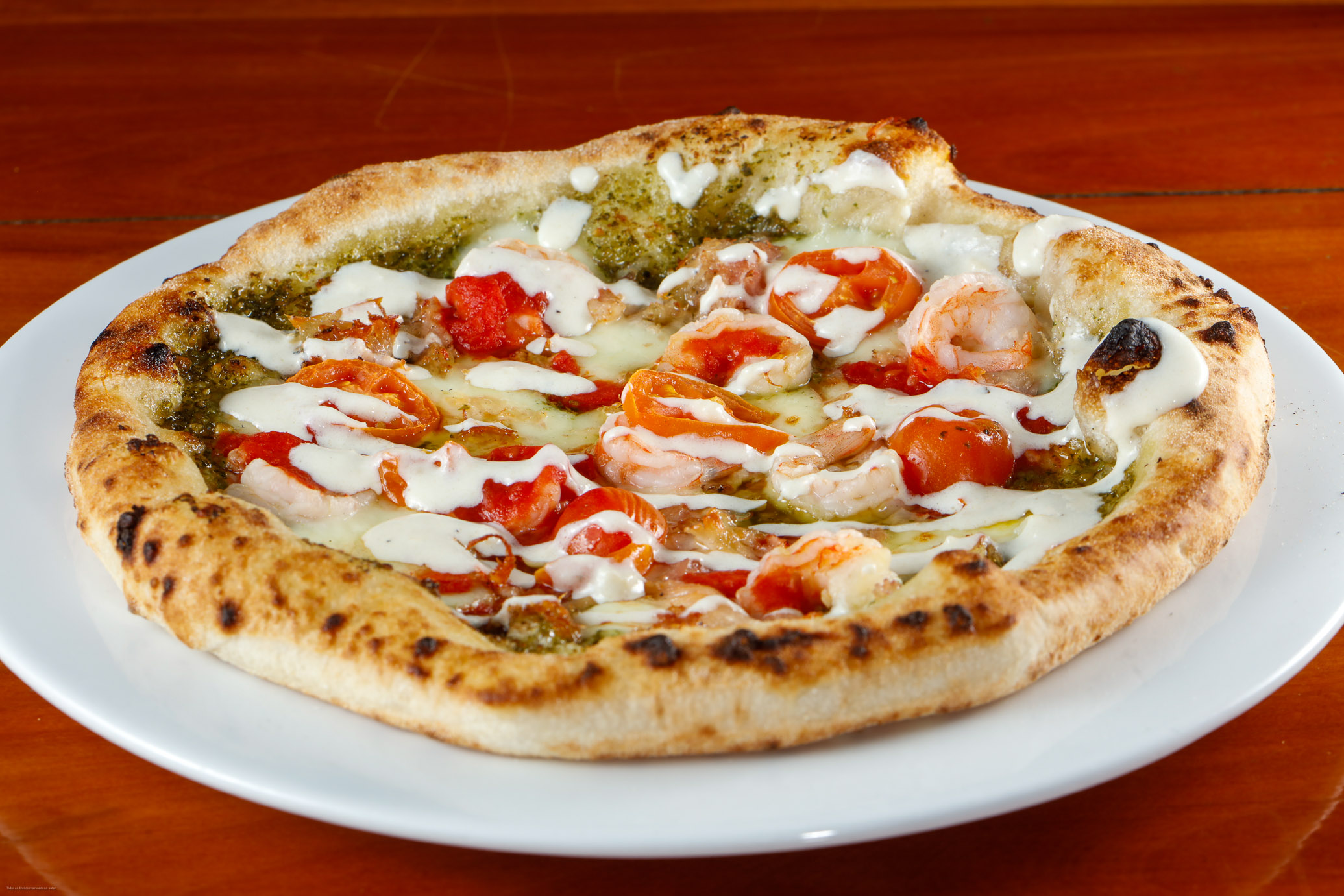 • Prato principal ( R$ 45)- Terra e Mare (pizza napolitana com pesto de manjericão, muçarela de búfala, pancetta curada e camarões VM, finalizada com fonduta de scamorza defumada e grana padano 12 meses)