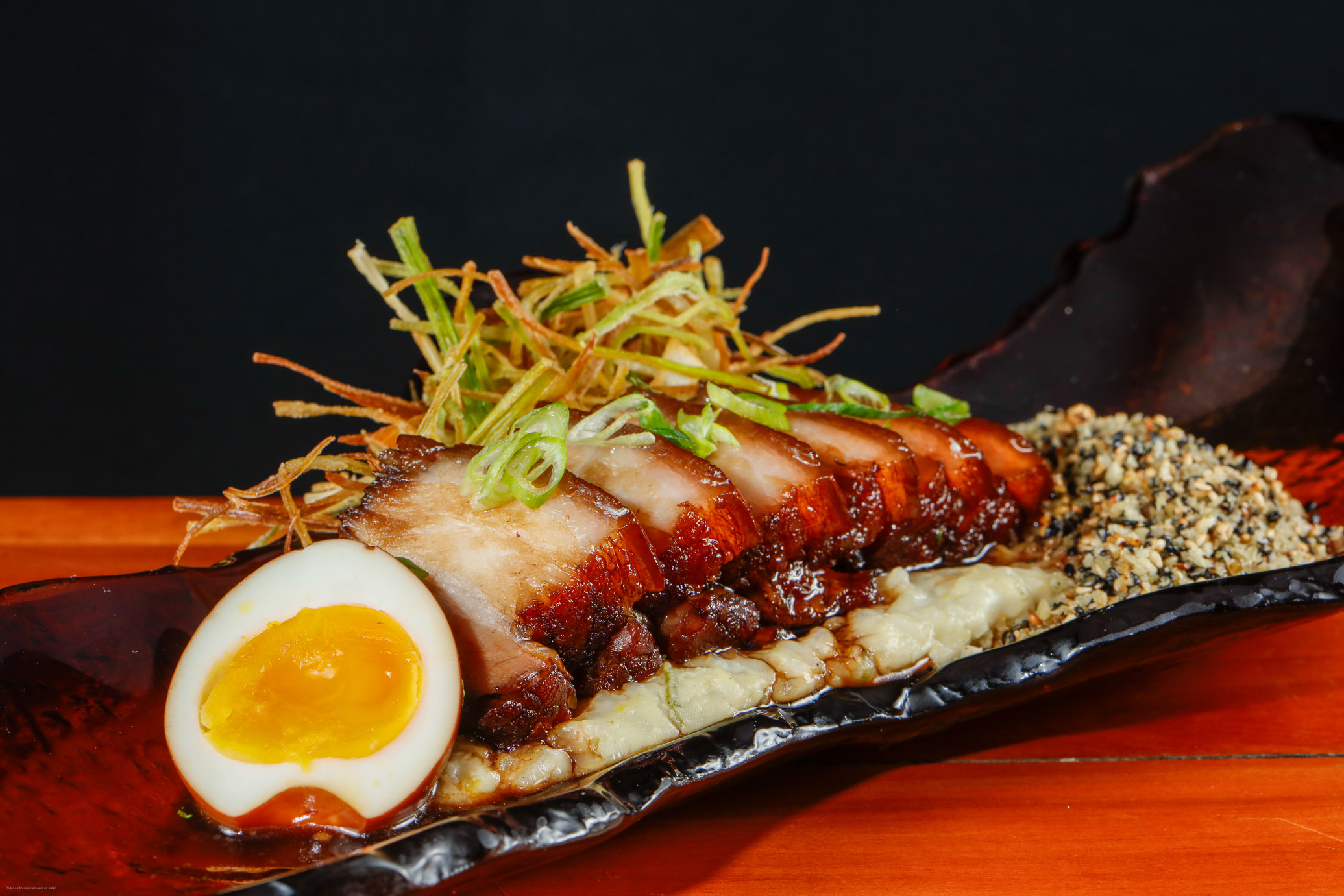 • Prato principal ( R$ 40) –Honorável Leitão (panceta ao forno caramelizada no molho teriyaki, arroz cremoso de alho-poró, ajitama, farofa com gergelim e crispy de alho-poró)